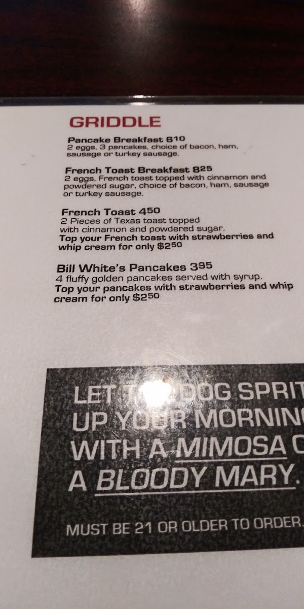 2 eggs, 3 pancakes, choice of bacon, ham, sausage or turkey sausage.
